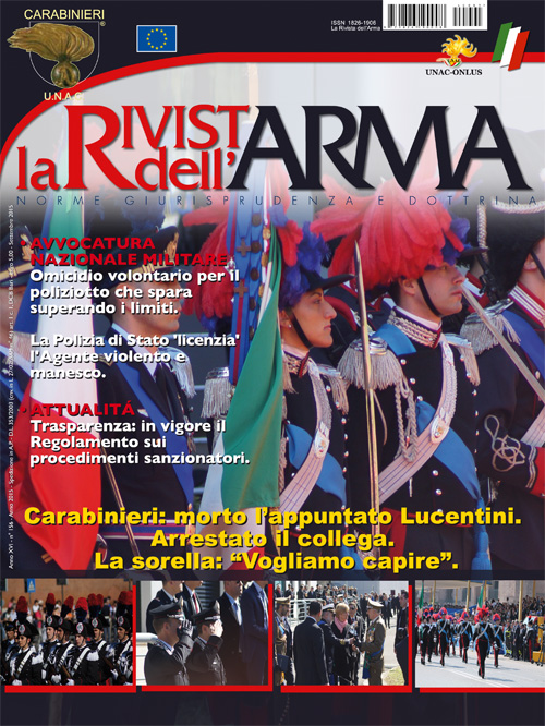 EDITORIALE: FESTA ARMA 2016- IL SOLITO CLASSISMO; NOTIZIE DALL’ARMA: Encomi a Roma; Nuova Caserma a Roma, accerchiata la Raggi; Omicidio De Marchi; Napoli Premiati i CC; SINDACALE: Gabrielli boccia L’Arma –Forestale; Orario di Lavoro Sentenza Unione Europea; Piano triennale ANAC- Differenze tra Civili e Militari; Follia Armaiola; Grido di dolore dei Carabinieri; Sul Silenzio-Rifiuto- Consiglio di Stato; Direttive Militari in Congedo; Omicidio Carabinieri- Parla il Pentito; PARLAMENTO: Interrogazione Parlamentare; Polizia Locale; ATTUALITA’: Riserve naturali vera ecologia. E TANTO ALTRO ANCORA A FAVORE DI TUTTI I CARABINIERI E MILITARI. |